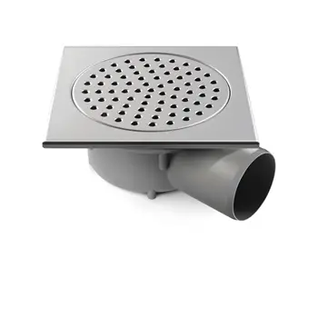 Lavtbyggende gulvsluk med 90° sideutløp, av grå sveisbar PEH-plast. Uttagbar 50 mm pungvannlås. Klemring skrues til sluk.